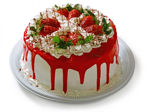Bolo branco, creme de leite condensado, chantilly e morango. Cobertura nata
