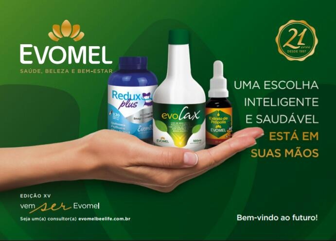 Com um portfólio com mais de 150 itens, entre alimentos funcionais, suplementos alimentares, perfumaria, cosméticos e nutricosméticos, que cuidam da sua beleza de dentro para fora, a Evomel está há mais de 20 anos no segmento de produtos feitos com matérias-primas naturais. Entre eles, o mel é o grande protagonista, e está presente na grande maioria dos produtos.