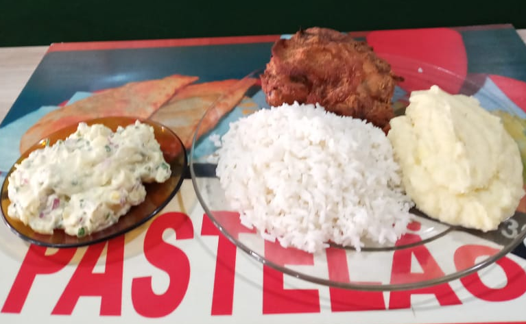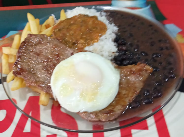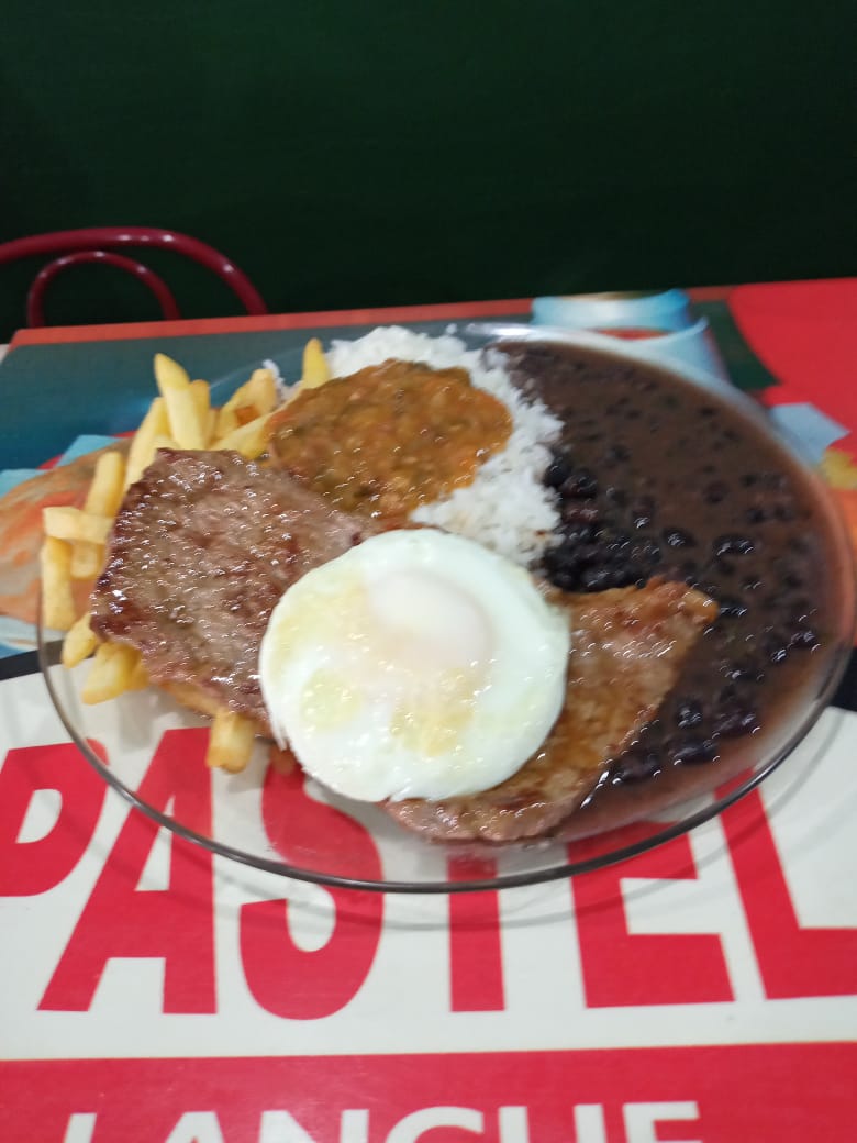 Arroz branco, batata frita, bife de frango e ovo frito