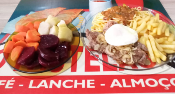 Massa caseira com molho, batata frita, ovo frito, bife de rês com cebola