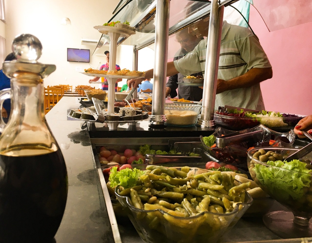 O destaque fica para as carnes e saladas.