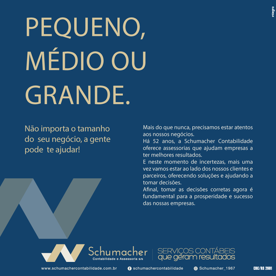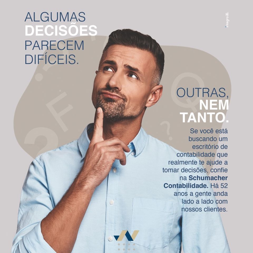 A Schumacher Contabilidade e Assessoria iniciou suas atividades em 1967. De lá para cá, o escritório cresceu, conquistou credibilidade pela excelência dos serviços prestados e hoje atua em todo o estado do Rio Grande do Sul. Em 1995, visando ampliar o mix de serviços oferecidos aos clientes, a Schumacher passou a contar também com uma assessoria jurídica própria.